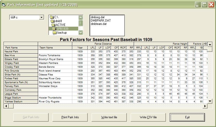 I have put together a program to display and/or print the following park information (fence distances, fence heights and hitting factors) for all of the parks in a season folder.